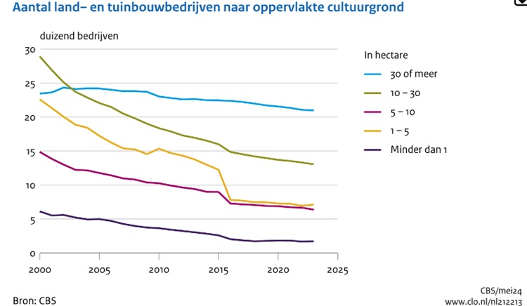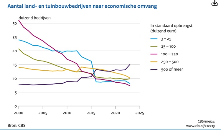 Het totale aantal land- en tuinbouwbedrijven daalt al enkele decennia. Het aantal grote bedrijven (met een standaardopbrengst van 500 duizend euro en meer) is daarentegen toegenomen van 7,7 duizend in 2000 tot 15,1 duizend in 2023.