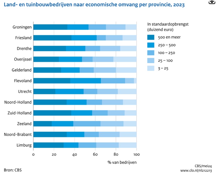 De verdeling van de economische omvang van alle bedrijven per provincie laat twee opvallende verschillen zien. In de provincie Flevoland komen relatief weinig kleine bedrijven, met minder dan 25 duizend euro standaardopbrengst voor. In de provincies Zuid-Holland, Flevoland en Friesland komen relatief veel grote bedrijven met 500 duizend euro standaardopbrengst en meer voor. In Zuid-Holland gaat het dan vooral om glastuinbouwbedrijven.