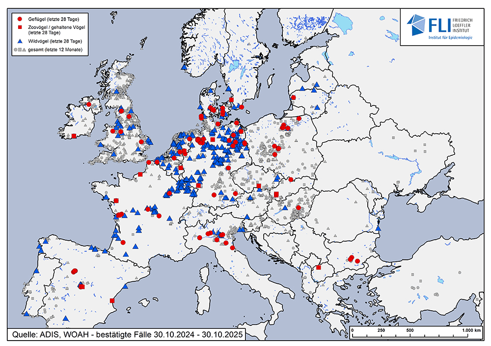In Duitsland is het aantal uitbraken van vogelgriep opnieuw sterk gestegen. Volgens de door het Friedrich-Loeffler-Institut (FLI) wekelijks bijgewerkte kaart werd in de afgelopen week 20 nieuwe uitbraken bij pluimvee gemeld — dit is een verdubbeling ten opzichte van de vorige week. Tegelijkertijd werden 184 positieve gevallen bij wilde vogels geregistreerd.