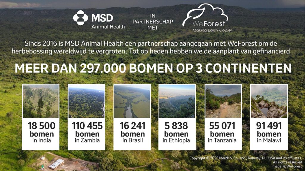 “Bij MSD Animal Health zijn we trots op de wereldwijde impact van het Tree Planting-initiatief in zeven bossen op drie continenten,” zei Rob Kelly, senior vice president EURAM en Global Marketing van het farmaceutische bedrijf. „Het onderstreept de waarde van strategische samenwerking en innovatie om duurzaamheid te bevorderen.”